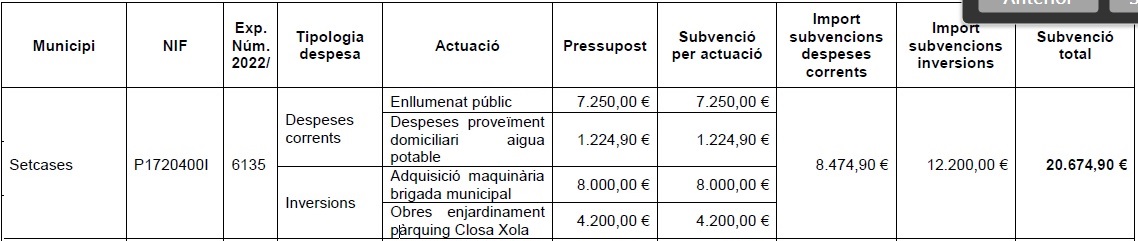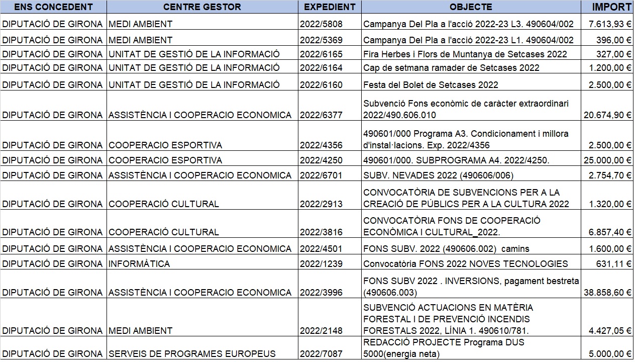 2023/3508 MONUMENTS Ajut per a la restauració de l’església de Sant Miquel de Setcases 11.000,00 € 2023/5280 ARXIU GENERAL Convocatòries subvencions projectes gestió documents i arxius ajuntaments de les comarques gironines 2023 2.963,46 € 2023/4707 ASSISTÈNCIA I COOPERACIÓ ECONÒMICA Subvenció Fons extraordinari 2023 (490.606.004) 20.674,90 € 2023/4102 INFORMÀTICA Fons 2023. Convocatòria 631,11 € 2023/1037 COOPERACIÓ CULTURAL CONVOCATÒRIA DE SUBVENCIONS PER A LA CREACIÓ DE PÚBLICS PER A LA CULTURA 2023 1.800,00 € 2023/3869 COOPERACIÓ ESPORTIVA 490615/001 A3 Condicionament i millora equipaments esportius Setcases 2023/3869 3.232,15 € 2023/4099 ASSISTÈNCIA I COOPERACIÓ ECONÒMICA SUBV. FONS 2023. Despeses corrents. I camins 12.186,95 € 2023/2186 ASSISTÈNCIA I COOPERACIÓ ECONÒMICA SUBVENCIÓ FONS DE COOPERACIÓ 2023. Bestreta inversió 490606/002 28.271,65 € 2023/4100 COOPERACIÓ CULTURAL FONS DE COOPERACIÓ CULTURAL _ 2023. 6.857,40 € 2022/10757 MEDI AMBIENT SUBVENCIÓ ACTUACIONS EN MATÈRIA FORESTAL I PREVENCIÓ INCENDIS FORESTALS 2023, LÍNIA 1. 490604/006. 4.098,27€ -