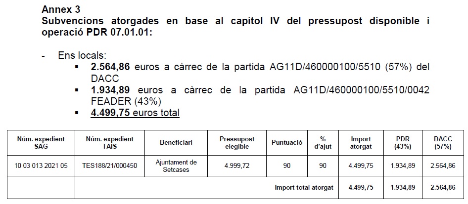 Total de l’ajut concedit: 26.172,30 €. Corresponent: 43% FEADER de la Unió Europea = 11.254,09 € i el 57% del Departament de territori i sostenibilitat de la Generalitat de Catalunya = 14.918,21 €