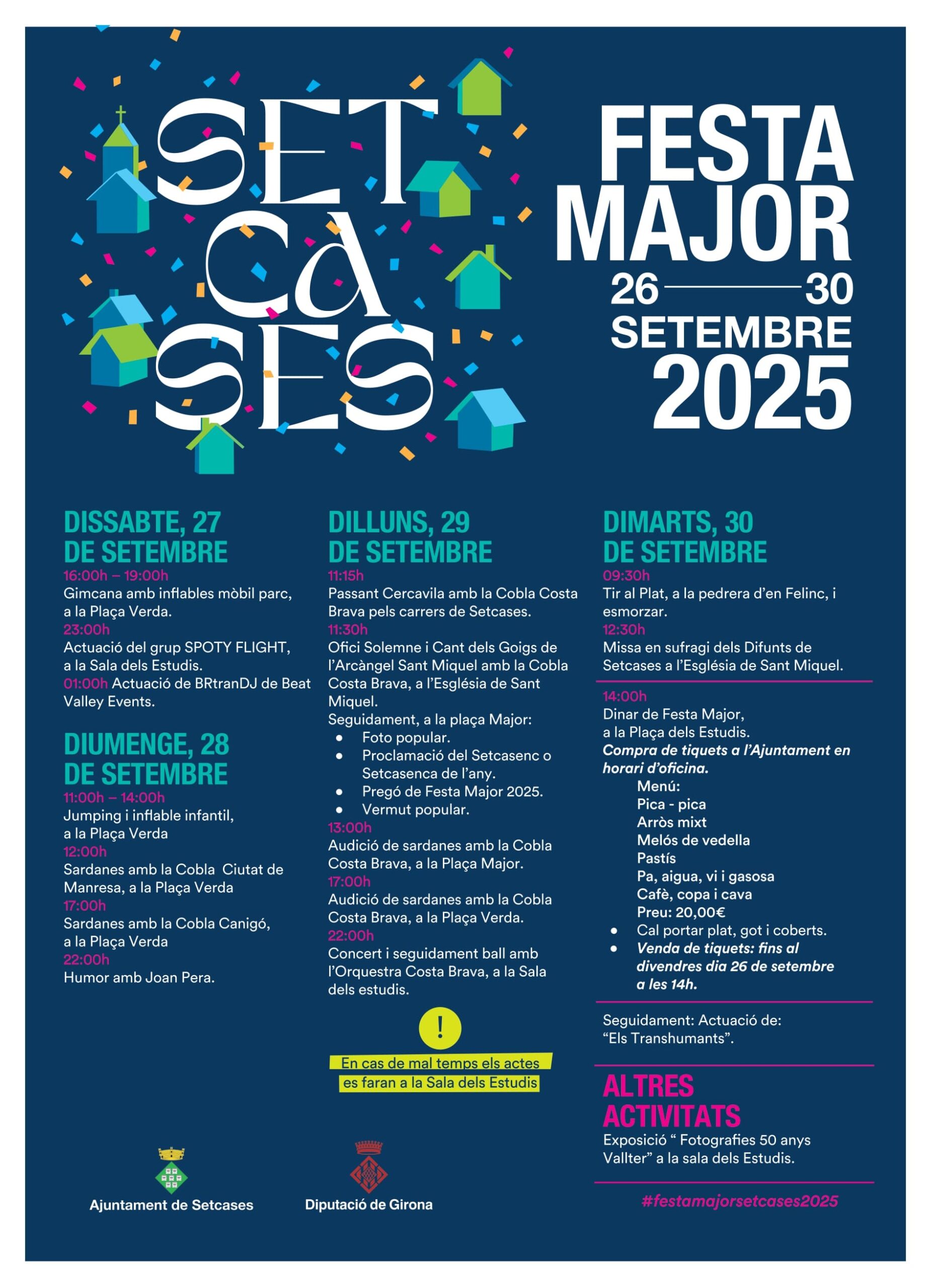 🎉 PROGRAMA DE LA FESTA MAJOR DE SETCASES 2025 🎉 📅 Del dissabte 27 al dimarts 30 de setembre DISSABTE, 27 DE SETEMBRE 🕓 De 16 h a 19 h: Gimcana amb inflables mòbil parc, a la Plaça Verda. 🎶 A les 23 h: Actuació del grup SPOTY FLIGHT, a la sala dels Estudis. 🎧 […]