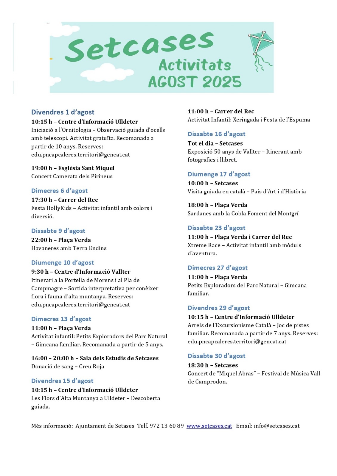 📆Agenda d’Activitats – Agost 2025 Aquest mes d’agost, Setcases s’omple de vida amb propostes per a tota la família: natura, cultura, música, activitats infantils i molt més!Consulta aquí tots els cartells i informació detallada de cada esdeveniment. AGENDA SETCASES
