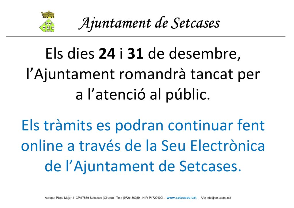 Els dies 24 i 31 de desembre, l’Ajuntament romandrà tancat per a l’atenció al públic.