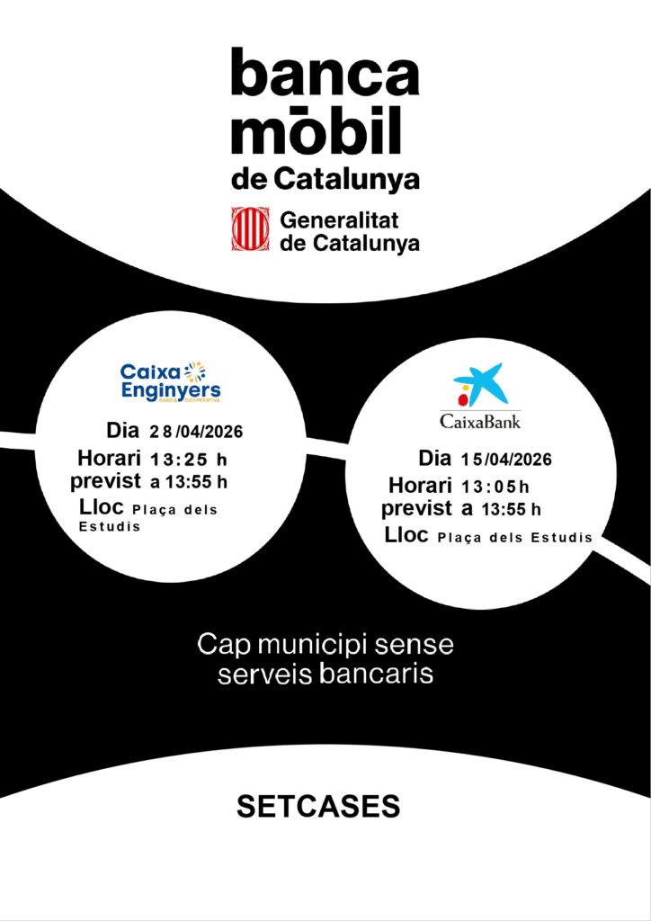 Actualitat, Agenda Servei banca mòbil a Setcases: mes d’abril 2026 01/04/2026 - 30/04/2026 | Plaça dels Estudis < Entrada AnteriorEntrada Posterior >
